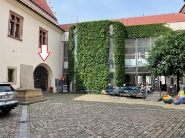 Do sálu se dostanete z Vodičkovy ulice (viz foto), odkud projdete průjezdem na nádvoří. Můžete se také držet ukazatelů na Café Neustadt, které vás dovedou do vnitrobloku. V prostru nádvoří je vstup do Novoměstské radnice na levé straně za historickou kašnou. Uvnitř budovy vystoupáte po schodišti, které začíná bezprostředně za vstupními dveřmi, do prvního poschodí přímo před dveře Velkého sálu.