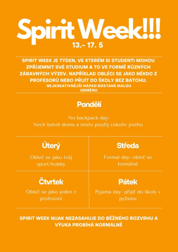jménem SIGu vás zveme na akci Spirit week, která se bude konat příští týden, tedy od 13. do 17. května. Spirit week je akce, které se mohou zúčastnit jak studenti, tak i profesoři. Každý den je nějaká výzva, tedy téma, podle kterého si můžete vybrat oblečení na tento den.