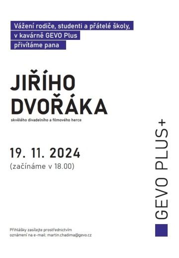 Milí studenti, kolegové, rodiče a přátelé školy, zveme vás srdečně na podzimní pokračování GEVO Kavárny Plus, kde bude naším hostem divadelní a filmový herec pan Jiří Dvořák.