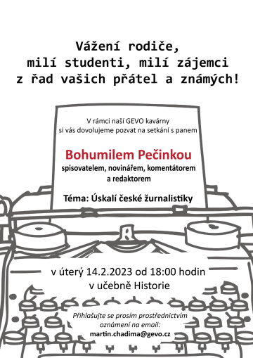 seriál přednášek GEVO Plus pokračuje v úterý 14. února od 18 hodin setkáním s politickým komentátorem a publicitou Bohumilem Pečinkou. Další informace naleznete v pozvánce.