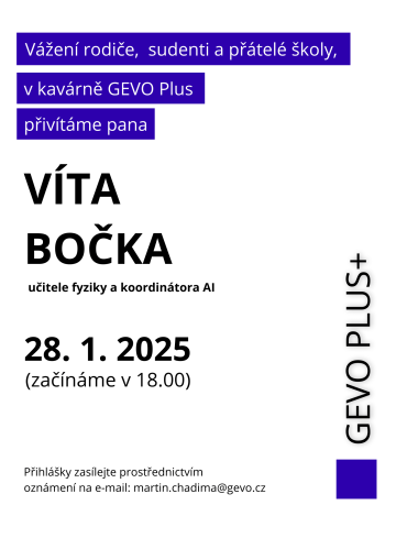 zveme vás na první setkání v roce 2025 v rámci GEVO kavárny Plus. A začínáme poněkud netradičně hostem, který vychází z našich vlastních učitelských řad. Kolega fyzikář Vít Boček se dlouhodobě intenzivně zabývá teorií i praxí umělé inteligence. Věříme, že uvítáte možnost vyslechnout novinky ze světa AI a prodiskutovat vaše vlastní názory týkající se tohoto fenoménu.
