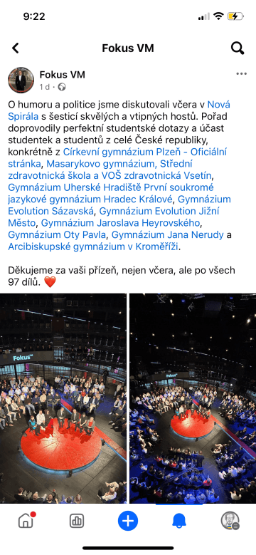 V úterý 13.3.2025 se více než tři desítky studentů GEVO spolu s ostatními středoškolskými studenty zapojili do živého natáčení pořadu Fokus Václava Moravce v Nové Spirále na Výstavišti. Téma bylo unikátní: Humor a politika. Hosté byli odborníci z nejpovolanějších: herečka Ester Pes Kočičková, teatrolog Vladimír Just, politická psycholožka Martina Klicperová, Tomáš Břínek (TMBK), politický influencer Fero Joke a bývalý politik Miroslav Kalousek.