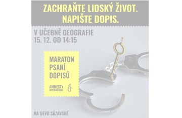 Jedná se o mezinárodní lidskoprávní akci, na které budeme společně psát dopisy nespravedlivě vězněným po celém světě. Akce se bude konat v učebně geografie 15. 12. od 14:15 do cca 16:00 na Gymnáziu Sázavské. Čas, kdy přijdete a jak dlouho na akci strávíte, je na vás a tom, jak moc se budete chtít rozepsat. (Připojit se bude možné i online.)